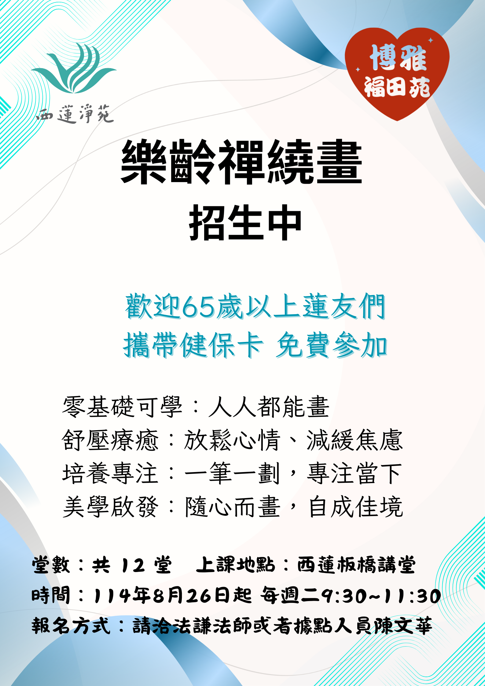 博雅福田苑從8/26起,每週二上午9:30-11:30開辦“樂齡禪繞畫”課程,一期12堂課。
