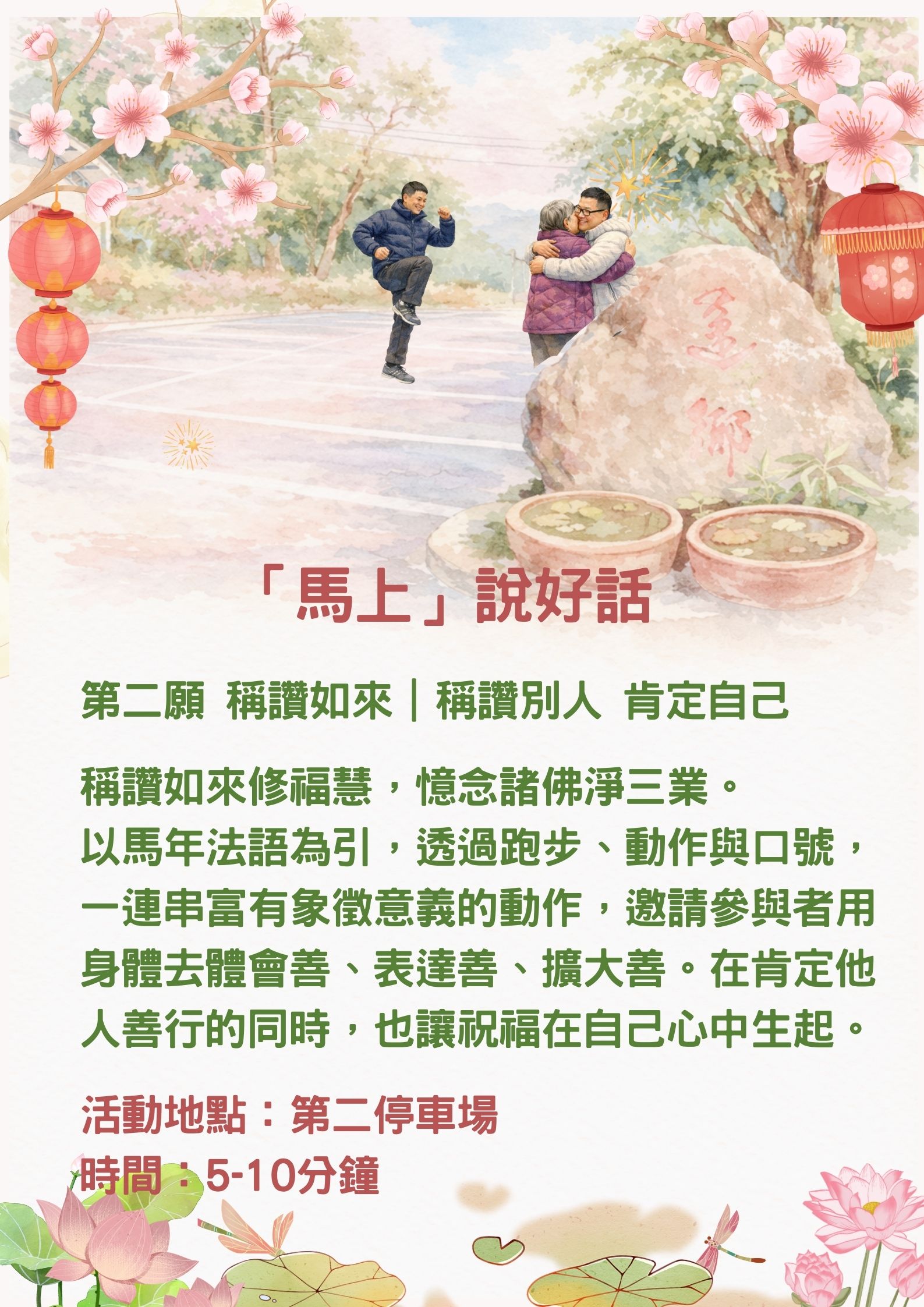 透過結合馬年法語精神的動作與口號,練習體會善、表達善、擴大善。「馬上」說好話,肯定他人的善行,在心中綻放祝福。