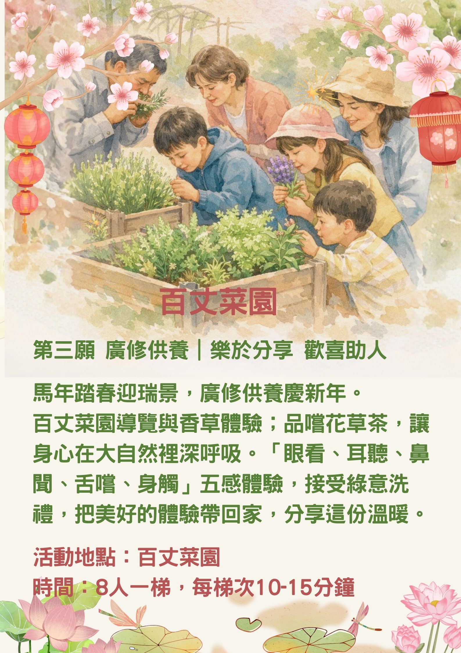 走入百丈菜園,在導覽與香草茶體驗中,親近大地,啜飲自然恩澤,將喜悅分享他人,化為歡喜助人的善願。