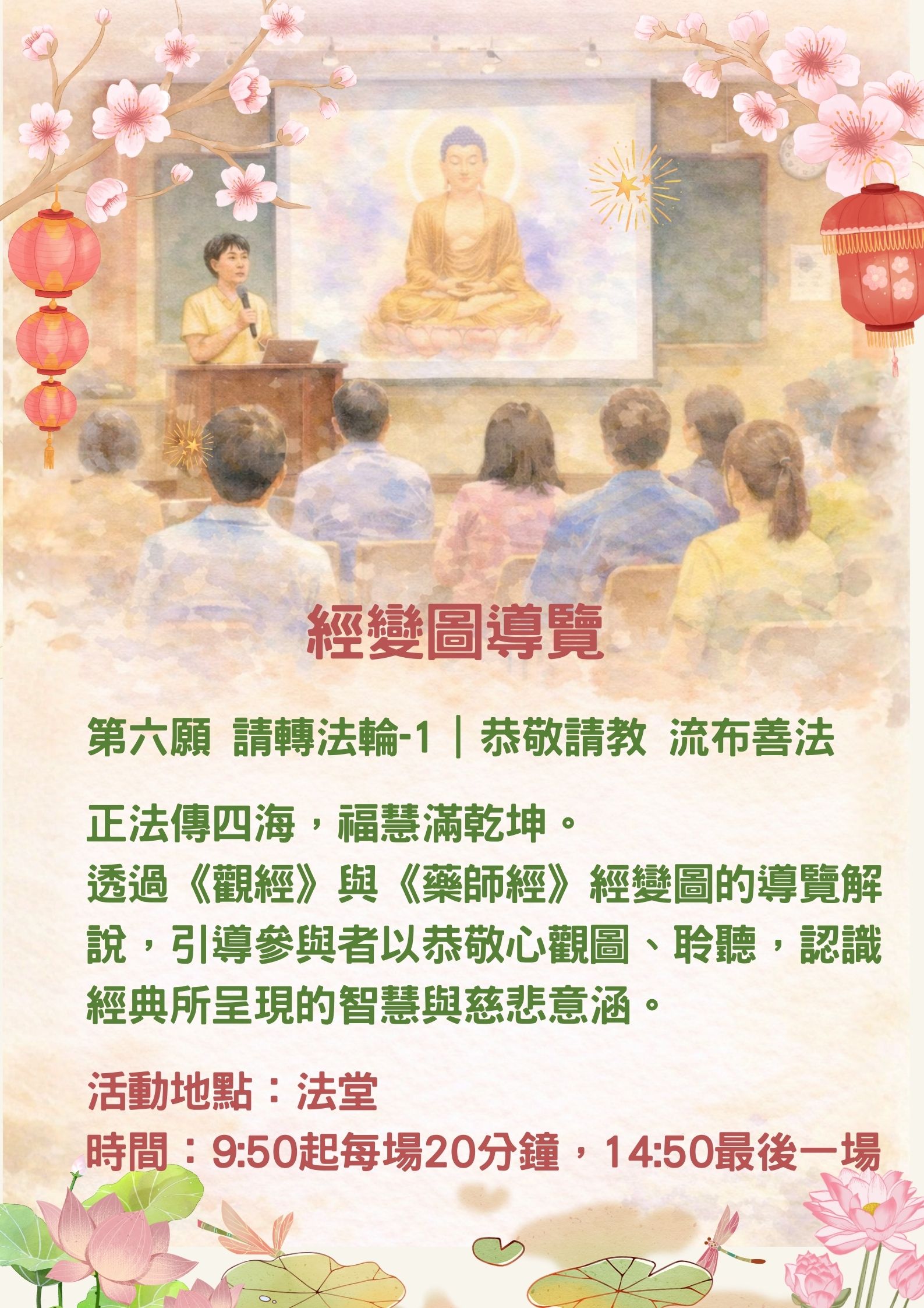 聆聽經變圖導覽,學習《觀經》與《藥師經》中蘊含的慈悲與智慧,體會利人利己、自度度人的願心。