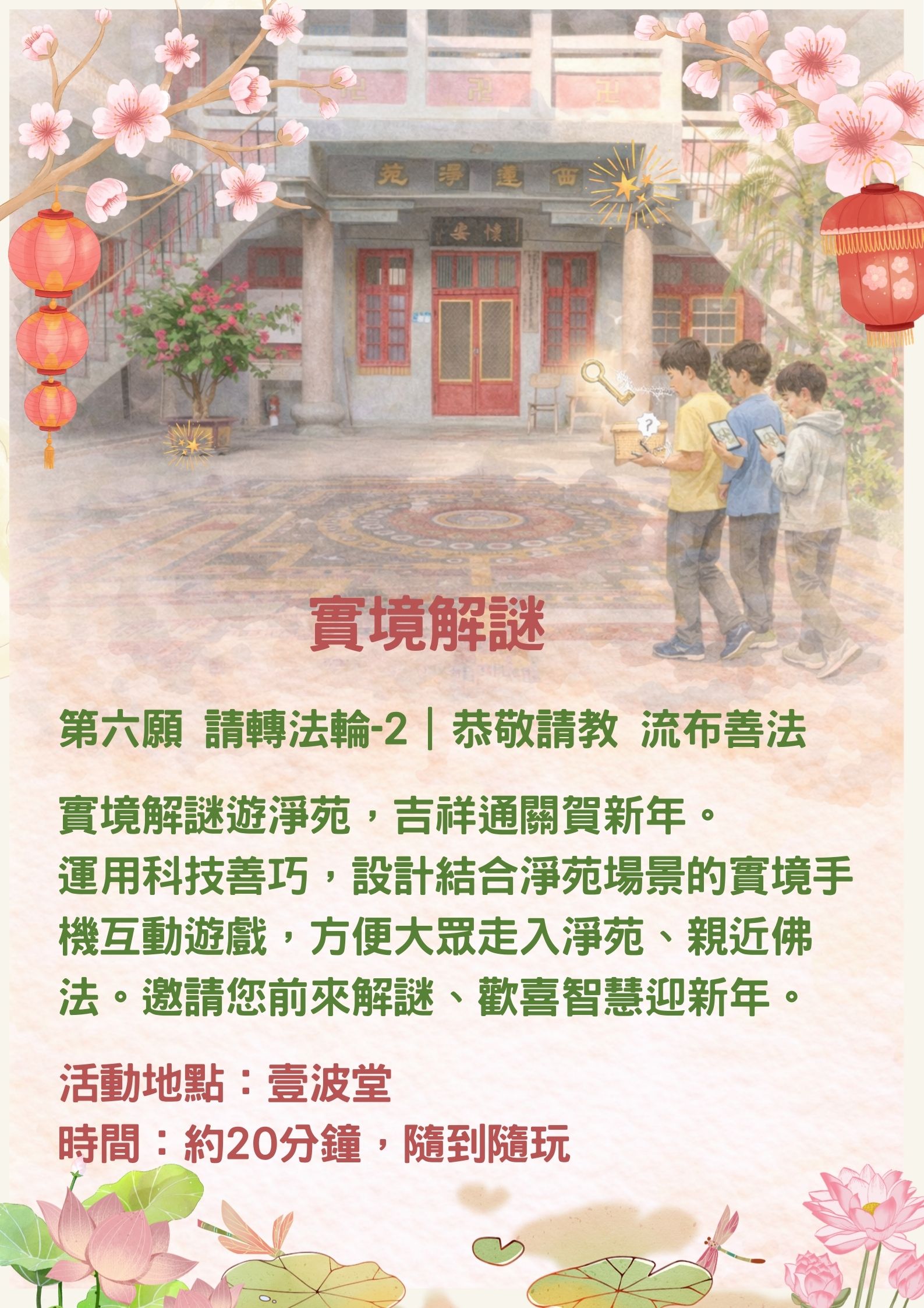 拿起手機挑戰「實境解謎」,在遊戲中探索佛法與淨苑歷史,寓教於樂,老少咸宜。