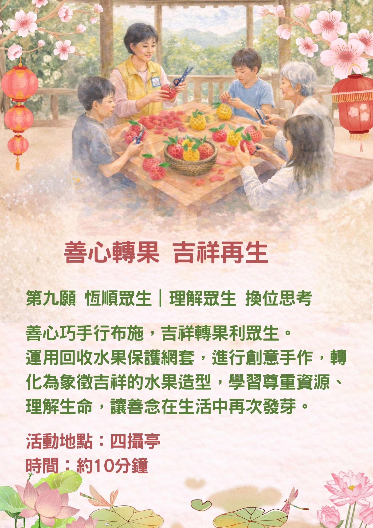 參加「善心轉果」水果造型DIY,運用回收素材創作環保藝術,練習換位思考,實踐恆順眾生的慈悲智慧。