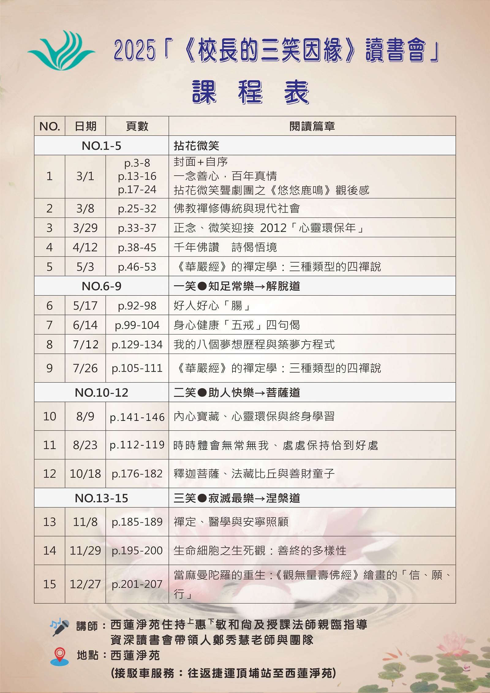 透過讀書會的交流與分享,學習如何將「微笑」融入生活,享受學習佛法的喜悅與樂趣。