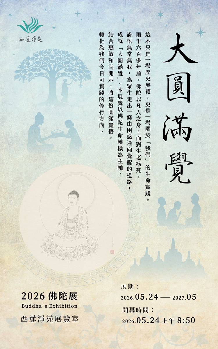 同時,「大圓滿覺—2026佛陀展」亦於此殊勝因緣中隆重開幕,引領大眾走入佛陀的生命歷程。看佛陀如何以凡人之身,體悟無常無我,由迷轉悟,成就圓滿覺悟。由見佛而觀心,懷抱純敬(淨)之意,隨林季鋒老師〈南無本師釋迦牟尼佛〉水墨白描圖秀緻有力的線條;以純淨平等之一念心,描繪並開展屬於自己的菩薩道。